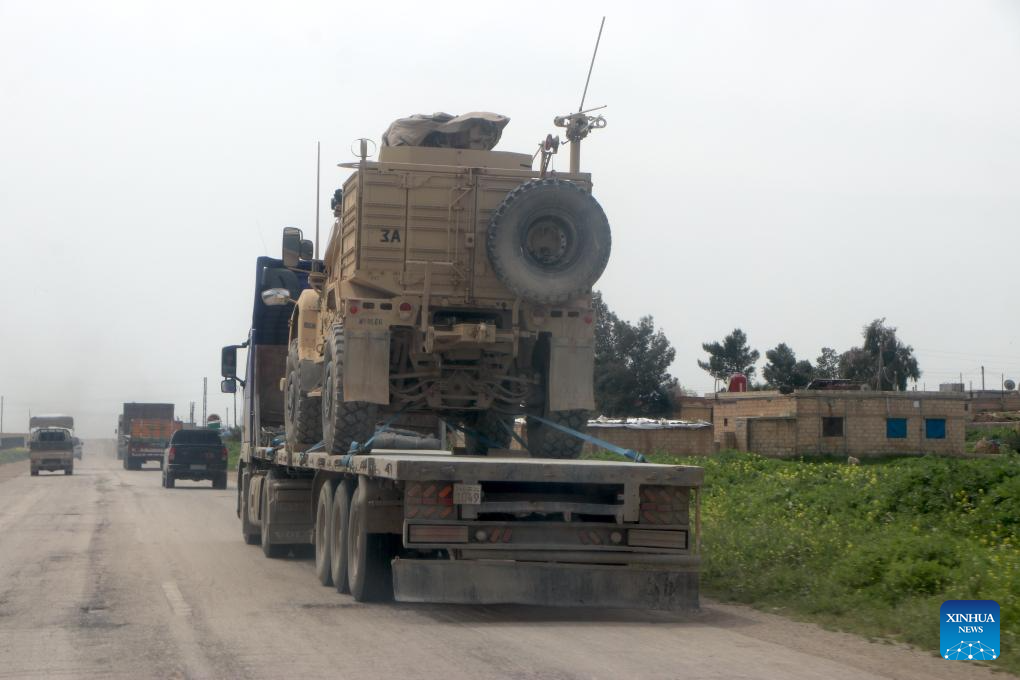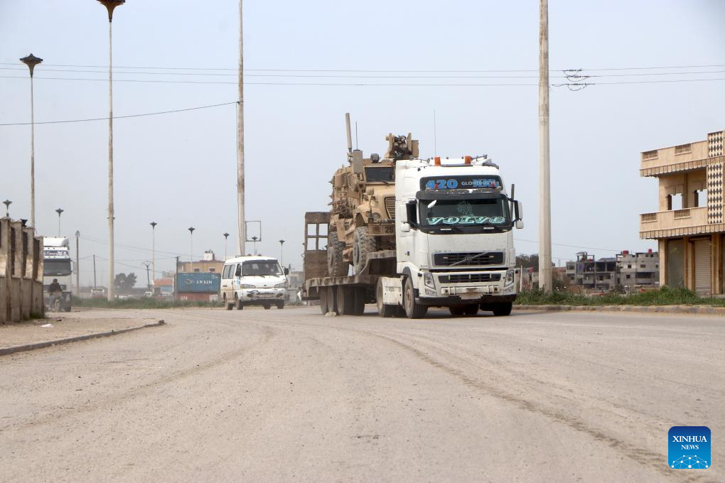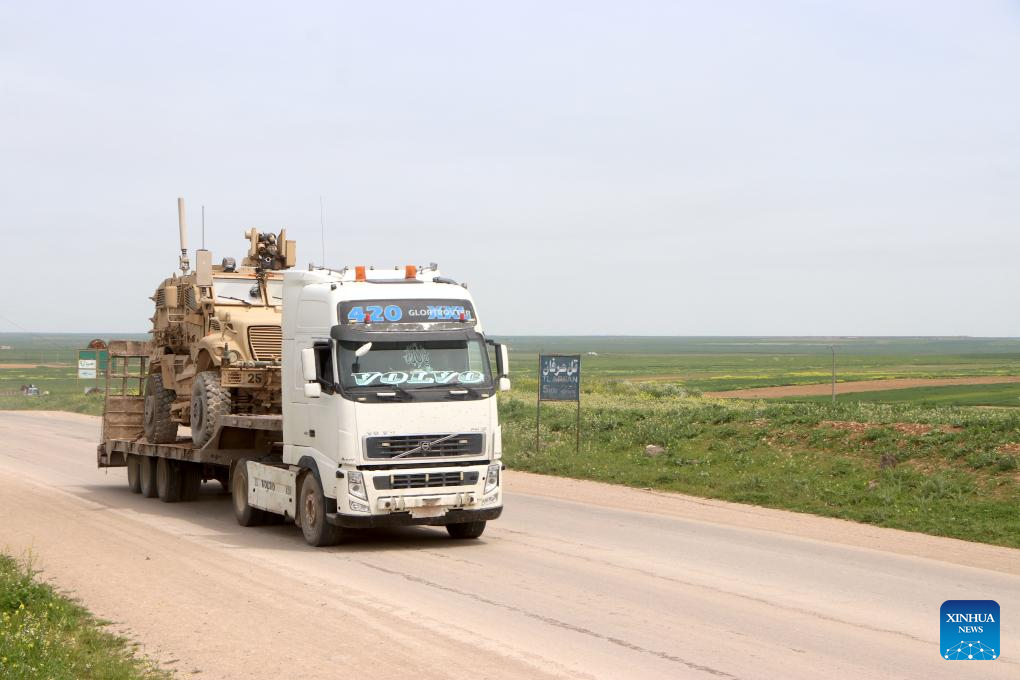 A truck transports military equipment in Hasakah province, Syria, April 16, 2026. Syria's foreign affairs authority said Thursday that all military sites previously used by U.S. forces in the country have been evacuated and transferred to the Syrian interim authority, marking the completion of the U.S. military withdrawal. (Str/Xinhua)