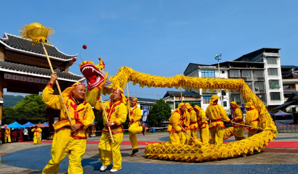 People perform a dragon dance in an event celebrating the Sanyuesan Festival in Rong'an County of Liuzhou, south China's Guangxi Zhuang Autonomous Region, April 19, 2026. The Sanyuesan Festival is a traditional festival celebrated on the third day of the third lunar month by various ethnic groups in China, which falls on April 19 this year. (Photo by Tan Kexing/Xinhua)