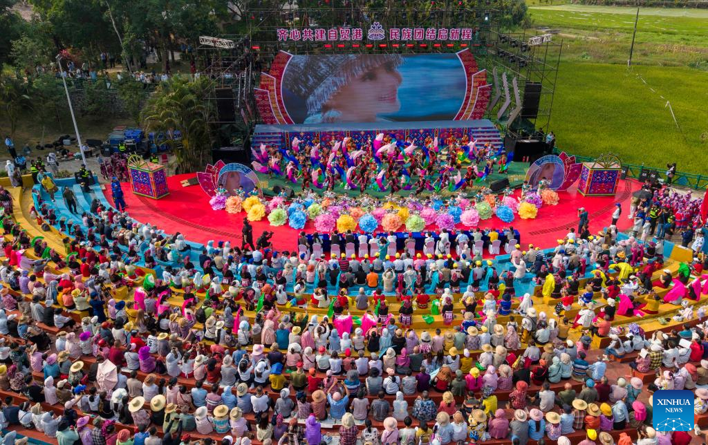 An aerial drone photo taken on April 19, 2026 shows an event celebrating the Sanyuesan Festival in Qionghai, south China's Hainan Province. The Sanyuesan Festival is a traditional festival celebrated on the third day of the third lunar month by various ethnic groups in China, which falls on April 19 this year. (Photo by Meng Zhongde/Xinhua)
