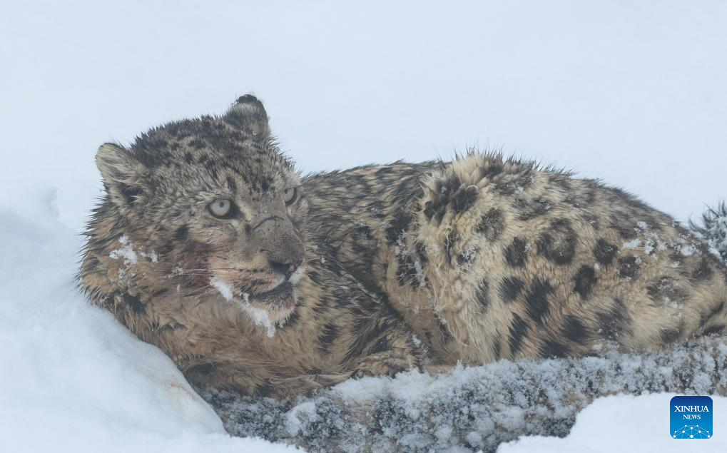 A snow leopard eats its prey at Lianbao Yeze scenic area in Aba County of Aba Tibetan and Qiang Autonomous Prefecture, southwest China's Sichuan Province, April 12, 2026. Known as the "king of the snow mountains," snow leopards are under first-class national protection in China. They are native to snow-capped mountains in central and southern Asia and serve as a barometer for the health of the entire high-altitude ecosystem. (Photo by Yongdan/Xinhua)