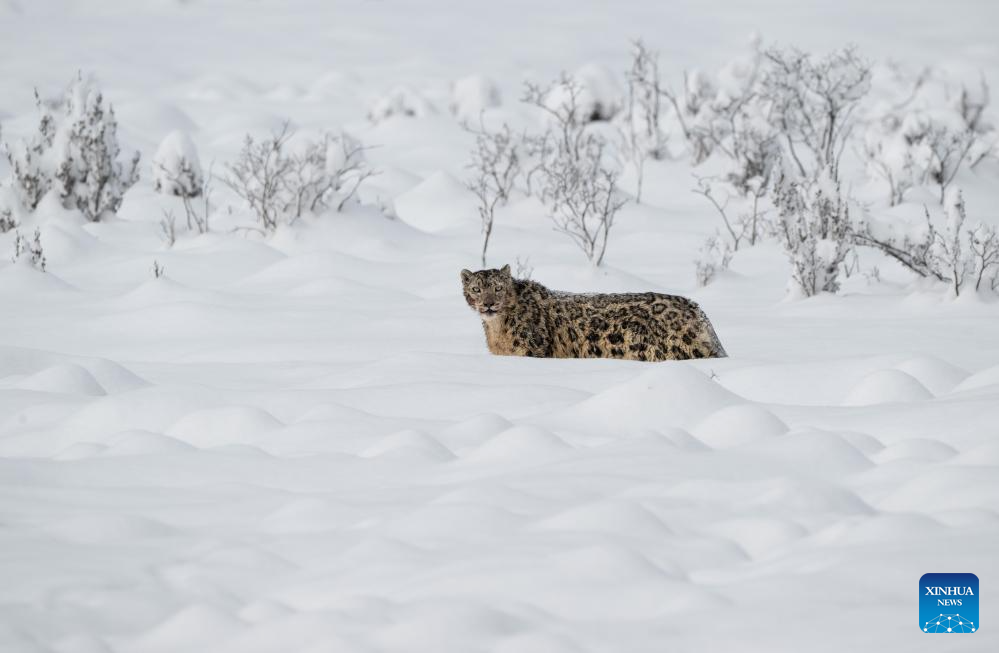 A snow leopard is pictured at Lianbao Yeze scenic area in Aba County of Aba Tibetan and Qiang Autonomous Prefecture, southwest China's Sichuan Province, April 12, 2026. Known as the "king of the snow mountains," snow leopards are under first-class national protection in China. They are native to snow-capped mountains in central and southern Asia and serve as a barometer for the health of the entire high-altitude ecosystem. (Photo by Yongdan/Xinhua)
