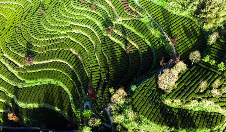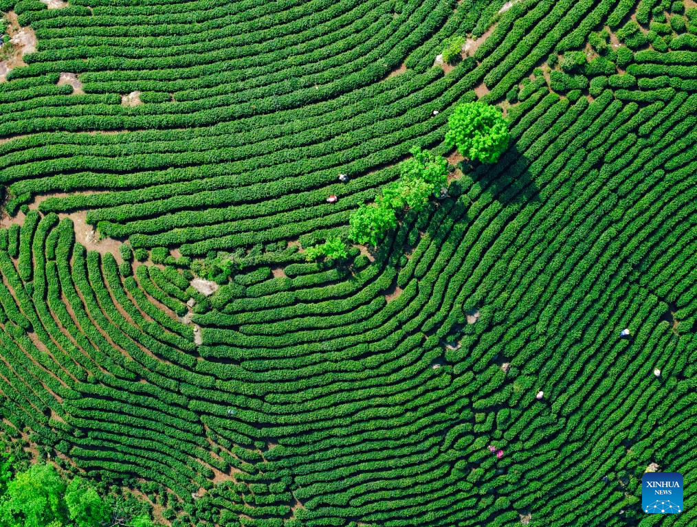 An aerial drone photo taken on April 18, 2026 shows farmers picking tea leaves at a tea garden of Huazhishan Village of Tunbao Township, Enshi Tujia and Miao Autonomous Prefecture of central China's Hubei Province, April 18, 2026. (Photo by Wen Lin/Xinhua)