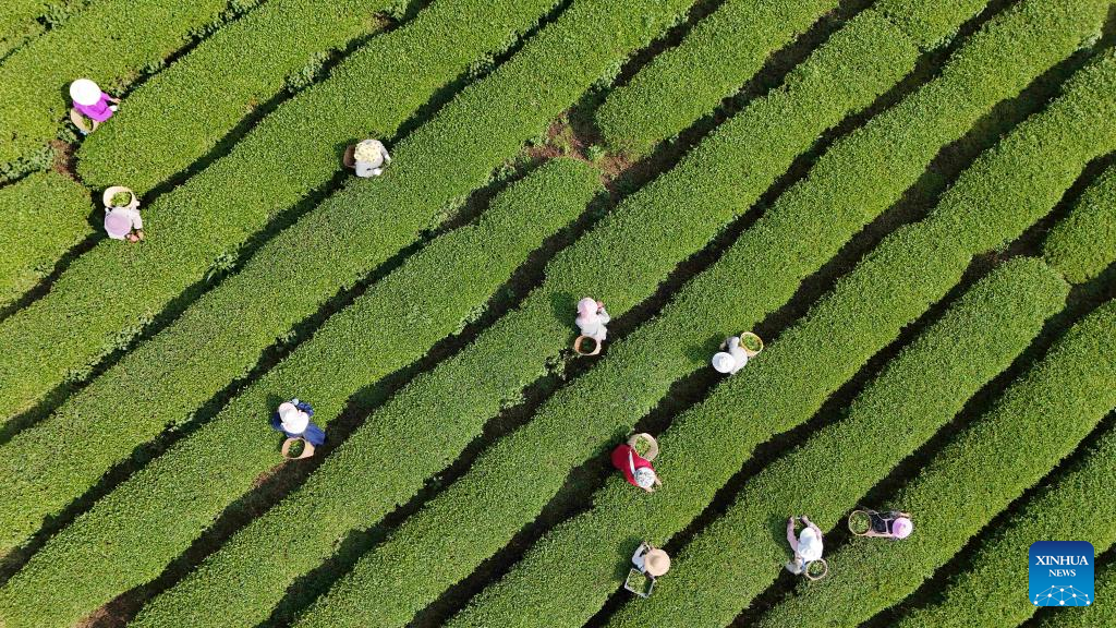 Farmers pick tea leaves at a tea garden in Guochang Village of Dianya Town of Baokang County, Xiangyang City of central China's Hubei Province, April 16, 2026. (Photo by Chen Quanlin/Xinhua)