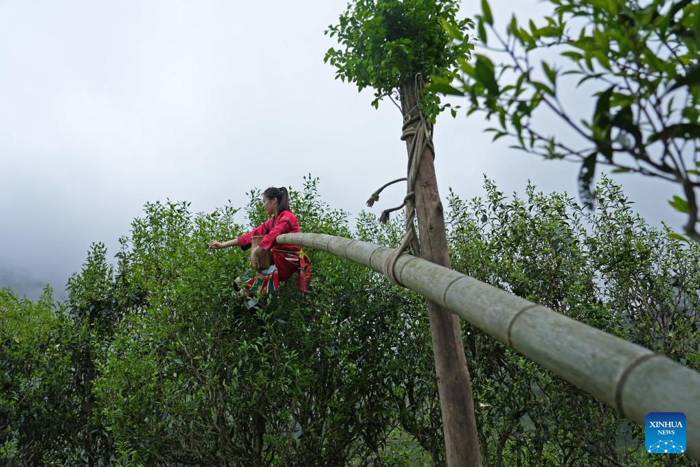 A tea picker picks tea leaves with a bamboo pole in Zhongliu Village of Longji Town, Guilin City of south China's Guangxi Zhuang Autonomous Region, April 15, 2026. (Photo by Wei Jiyang/Xinhua)