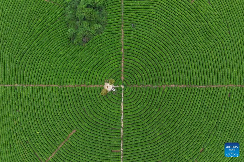 An aerial drone photo taken on April 19, 2026 shows a tea farm in Jichang Township of Anshun City, southwest China's Guizhou Province. (Photo by Cheng Hongkai/Xinhua)