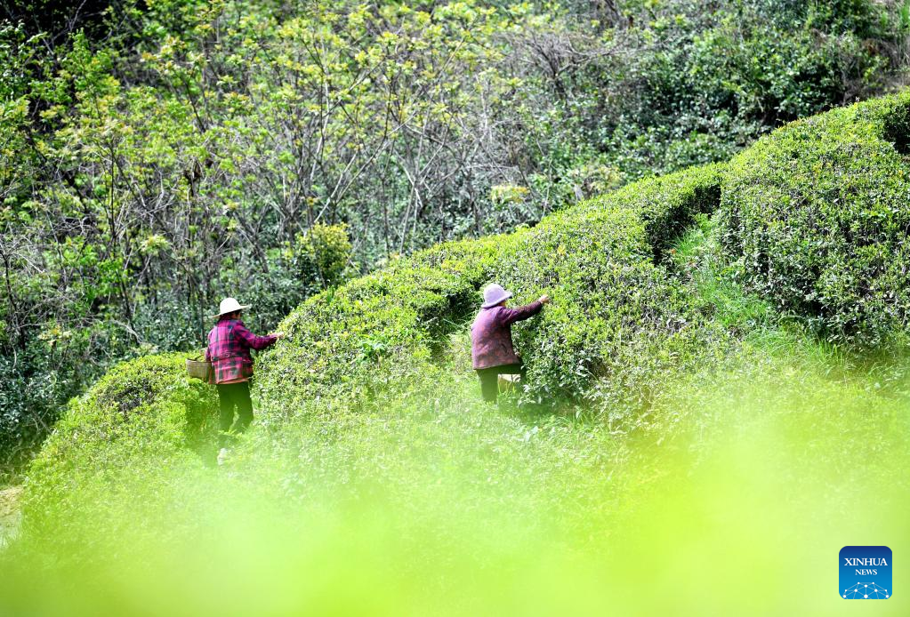 Farmers pick tea leaves at a tea garden in Tuantian Township of Tengchong City, southwest China's Yunnan Province, April 20, 2026. (Photo by Gong Zujin/Xinhua)