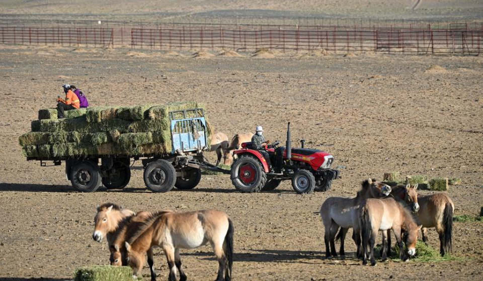 Staff members provide fodder to Przewalski's horses in the Kalamaili Nature Reserve in northwest China's Xinjiang Uygur Autonomous Region, April 21, 2026. (Xinhua/Ding Lei)