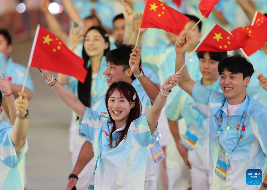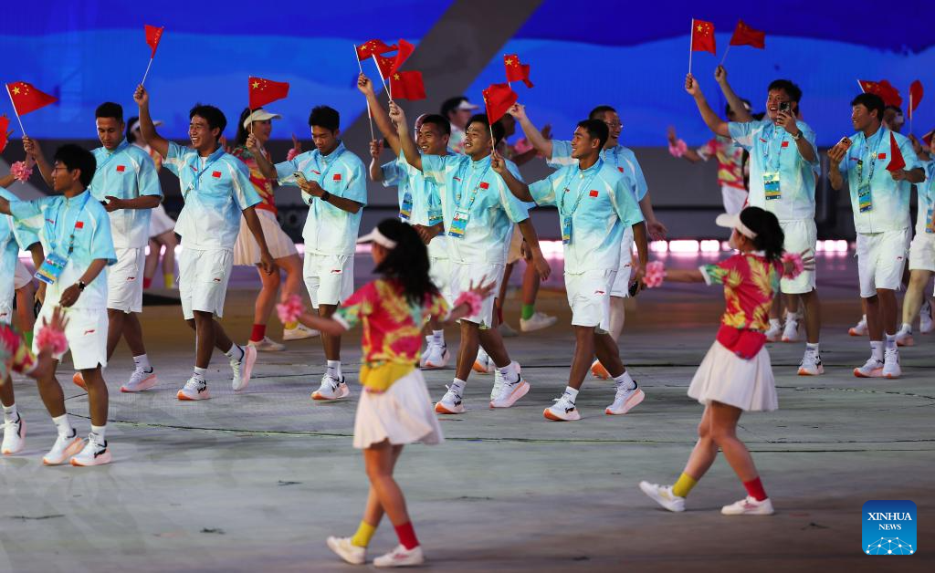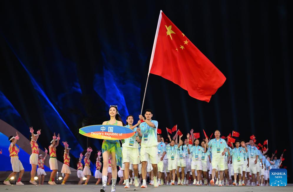 Members of the delegation of China parade during the opening ceremony of the 6th Asian Beach Games in Sanya, south China's Hainan Province, April 22, 2026. (Xinhua/Zhu Zheng)