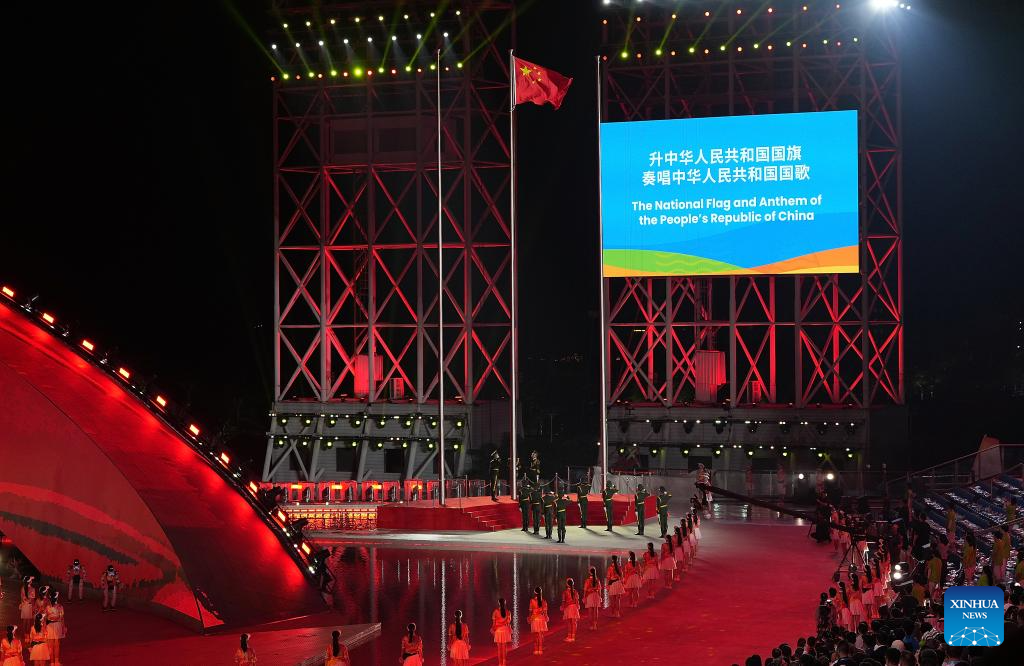 The Chinese national flag is raised during the opening ceremony of the 6th Asian Beach Games in Sanya, south China's Hainan Province, April 22, 2026. (Xinhua/Xu Bingjie)