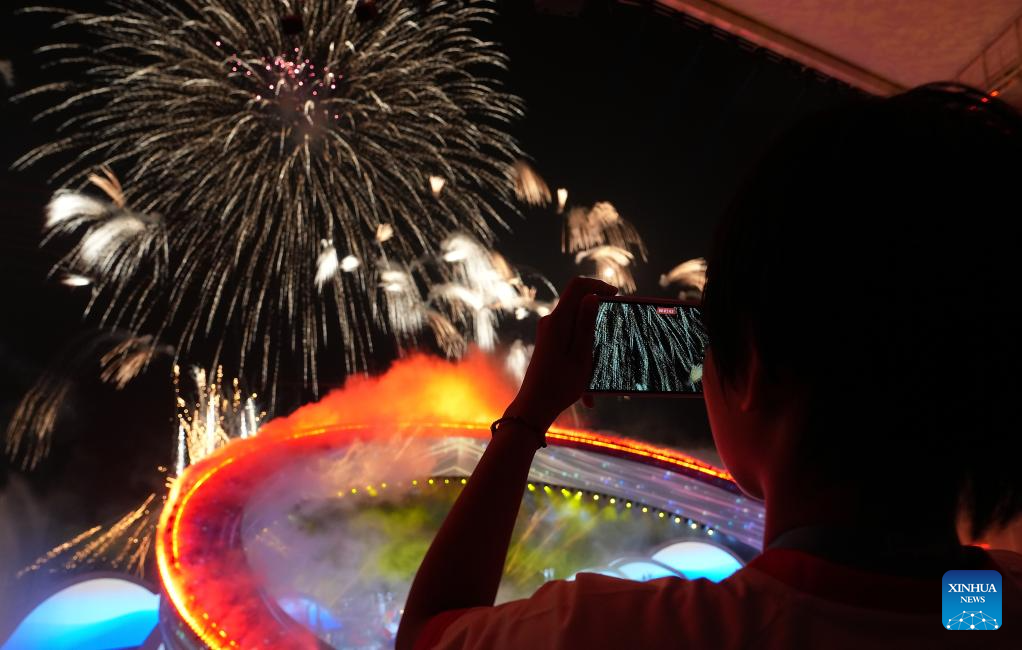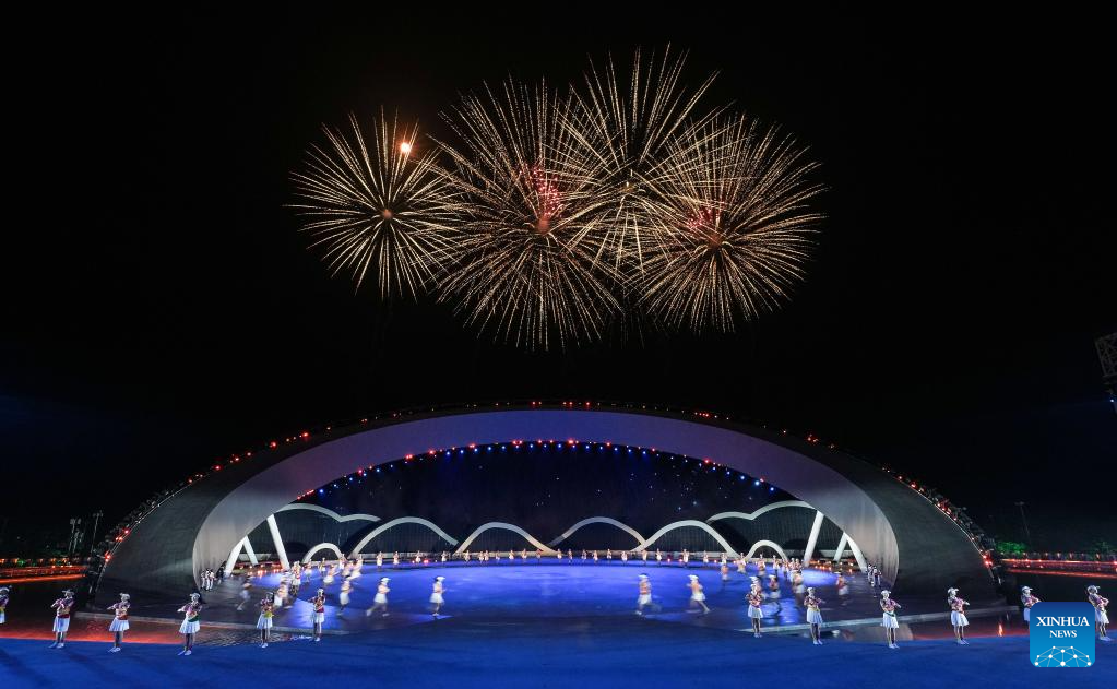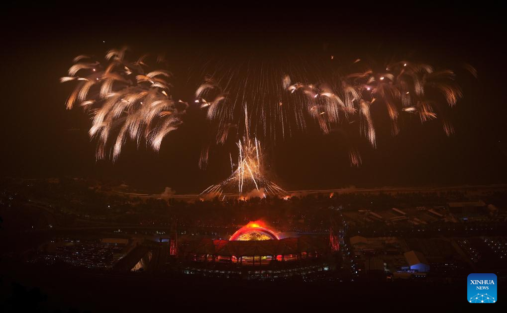 Fireworks illuminate the sky during the opening ceremony of the 6th Asian Beach Games in Sanya, south China's Hainan Province, April 22, 2026. (Xinhua/Guo Cheng)