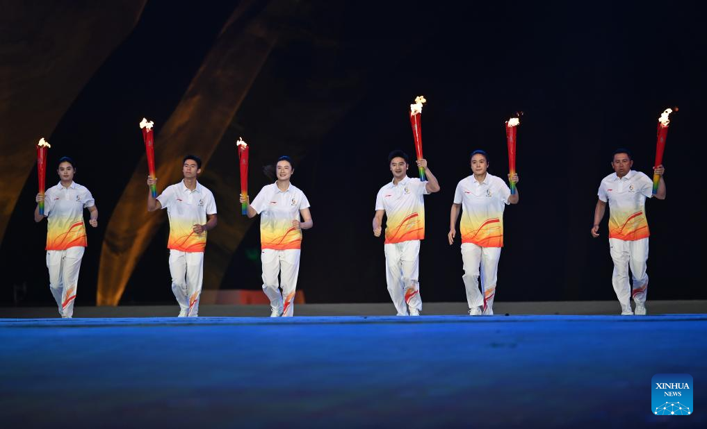 Torchbearers run with the torch during the opening ceremony of the 6th Asian Beach Games in Sanya, south China's Hainan Province, April 22, 2026. (Xinhua/Zhao Zishuo)