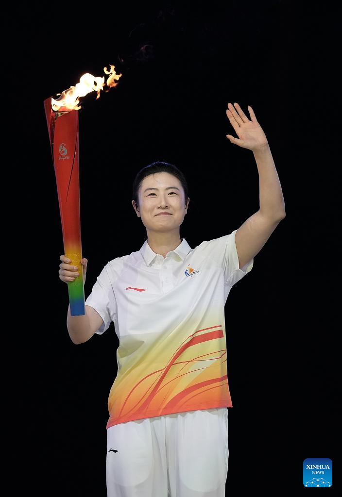 Torchbearer Ding Ning waves during the opening ceremony of the 6th Asian Beach Games in Sanya, south China's Hainan Province, April 22, 2026. (Xinhua/Zhao Zishuo)