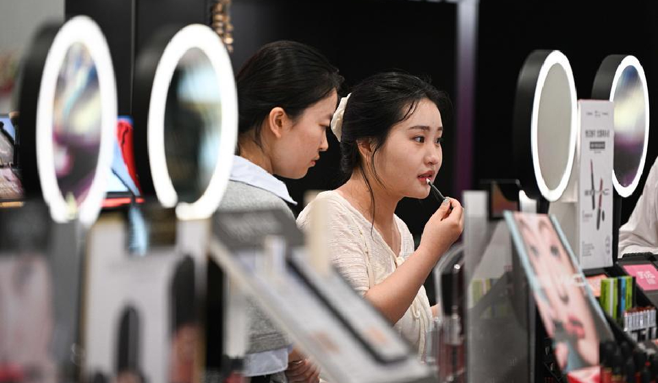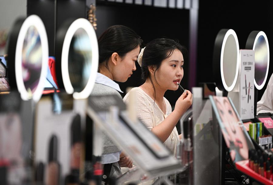 A customer tries makeup at a duty-free shop in Haikou, south China's Hainan Province, April 25, 2026. (Xinhua/Pu Xiaoxu)