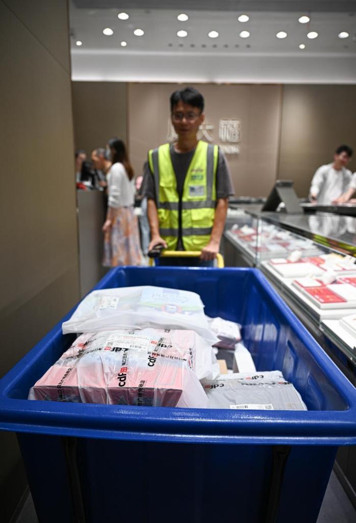 A staff member carries duty-free items for customers at a duty-free shop in Haikou, south China's Hainan Province, April 25, 2026. (Xinhua/Pu Xiaoxu)