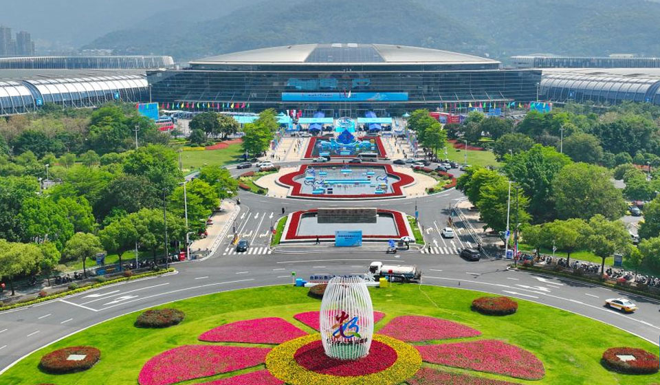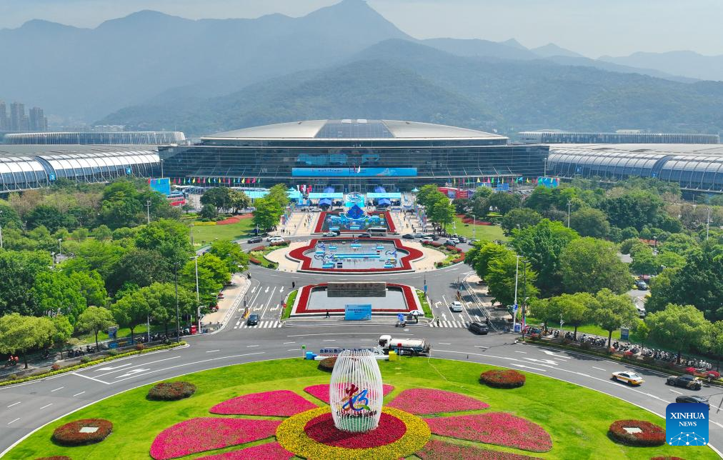 An aerial drone photo taken on April 28, 2026 shows Fuzhou Strait International Conference &Exhibition Center, Fuzhou, southeast China's Fujian Province. The AI market kicked off here ahead of the 9th Digital China Summit, which will convene in Fuzhou from April 29 to 30. (Xinhua/Lin Shanchuan)